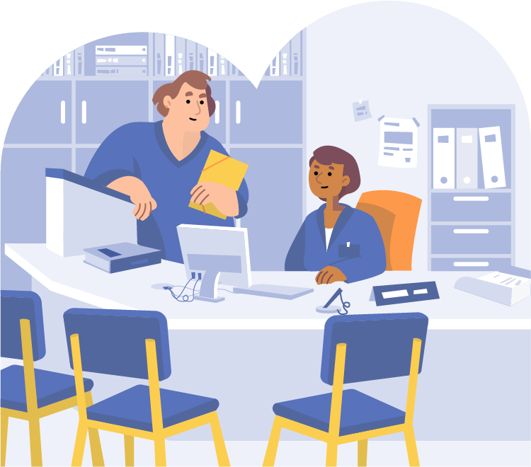 C’est ici qu’un employé de l'hôpital t'accueille, te renseigne et t’aide à trouver ton chemin à l’intérieur de l'hôpital.